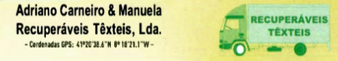 Adriano Carneiro & Manuela Recuperáveis Têxteis, Lda Automóveis / PortalGeraldoConselho Ver todos... Detalhes do contacto Rua da Costa,446Porto,4620-861 Lustosa - Lousada 253586595 geral@adrianocarneiro.pt Facebook Twitter Google+