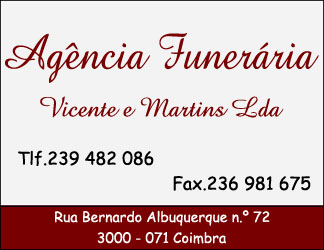 Agência Funerária Vicente e Martins Lda Serviços / PortalGeraldoConselho Ver todos... Detalhes do contacto Rua Bernardo Albuquerque n.º 72Coimbra,3000-071 - COIMBRA 239 482 086 Facebook Twitter Google+