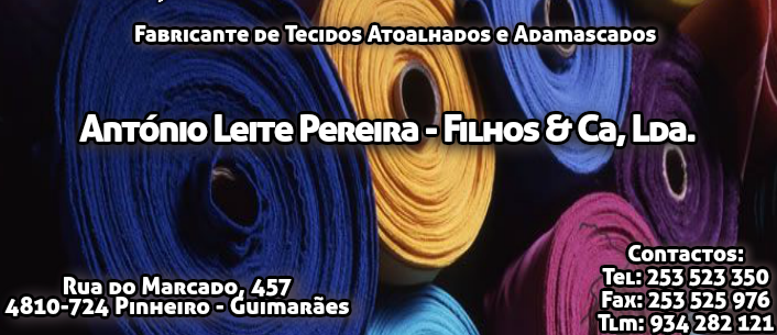 António Leite Pereira,Filhos & Ca, Lda. Indústria / PortalGeraldoConselho Ver todos... Detalhes do contacto Rua do Marcado 457Braga,4810-724 253 523 350 FAX: 253 525 976 Facebook Twitter Google+