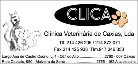 Clica - Clínica Veterinária de Caxias, Lda. Animais / PortalGeraldoConselho Ver todos... Detalhes do contacto Largo Ana de Castro Osório, Lj.4 - Qt.ª do Alto Lisboa,2760-007 - CAXIAS 214 426 206 Telemóvel 917 346 353 Fax 214 425 938 Facebook Twitter Google+