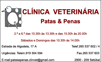 Clínica Veterinária Patas & Penas Animais / PortalGeraldoConselho Ver todos... Detalhes do contacto Estrada de Algodela, 17 ASetúbal,2900- 209 - SETÚBAL 265 537 602 Telemóvel 919 304 594 Fax 265 537 603 Facebook Twitter Google+