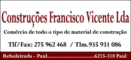 Construções Francisco Vicente Lda Comércio / PortalGeraldoConselho Ver todos... Detalhes do contacto Reboleirada - PaulLisboa,6215-318 - PAUL 275 962 468 Telemóvel 935 931 086 Facebook Twitter Google+