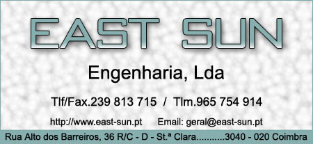 East Sun - Engenharia Lda Construção / PortalGeraldoConselho Ver todos... Detalhes do contacto Rua Alto dos Barreiros, 36 - R/C - D - Santa ClaraCoimbra,3040-020 - COIMBRA 239 813 715 Telemóvel 965 754 914 Fax 239 813 715 geral@east-sun.pt Facebook Twitter Google+