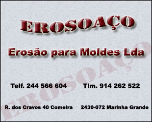 Erosoaço - Erosão p/ Moldes, Lda Serviços / PortalGeraldoConselho Ver todos... Detalhes do contacto R. Cravos 40 Comeira Marinha GrandeLeiria,2430-072 - VIEIRA DE LEIRIA 244 566 604 Telemóvel 914 262 522 Facebook Twitter Google+