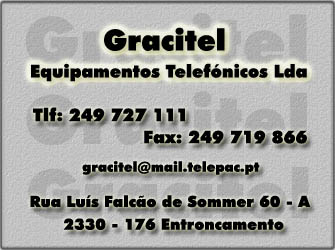 Gracitel - Comércio de Equipamentos Telefónicos, Lda. Comércio / PortalGeraldoConselho Ver todos... Detalhes do contacto R. Luís F Sommer 60 ASantarem,2330-176 - ENTRONCAMENTO 249 727 111 Facebook Twitter Google+