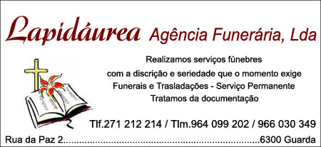 Lapidáurea Agência Funerária, Lda Serviços / PortalGeraldoConselho Ver todos... Detalhes do contacto Rua da Paz, 2Guarda,6300-000 - GUARDA 271 212 214 Telemóvel 964 099 202 Facebook Twitter Google+