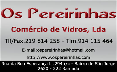Os Pereirinhas-Comércio de Vidros, Lda Comércio / PortalGeraldoConselho Ver todos... Detalhes do contacto Rua da Boa Esperança Lt.294 R/C - Bairro de São Jorge Lisboa,2620-222 - RAMADA 219 814 258 Telemóvel 914 115 464 Fax 219 814 258 ospereirinhas@hotmail.com Facebook Twitter Google+