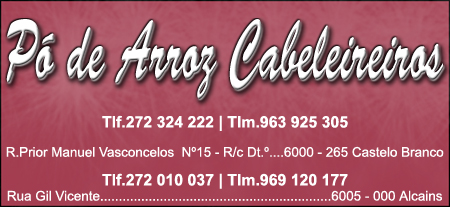 Pó de Arroz Cabeleireiros Beleza e Bem Estar / PortalGeraldoConselho Ver todos... Detalhes do contacto R.Prior Manuel Vasconcelos Nº15 - R/c Dt.ºCastelo Branco,6000 -265 - CASTELO BRANCO 272 324 222 Facebook Twitter Google+