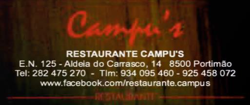 Restaurante Campu`s Restauração / PortalGeraldoConselho Ver todos... Detalhes do contacto Estrada Nacional 125, Aldeia do Carrasco, Nº 14Faro,8500 - Portimão 282 475 270 / Tlm: 925 458 072 rest.campus@gmail.com Facebook Twitter Google+