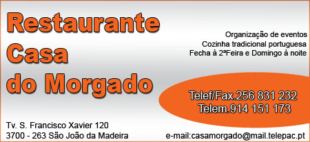 Restaurante Casa do Morgado Restauração / PortalGeraldoConselho Ver todos... Detalhes do contacto Tv S.Francisco Xavier, 120 Madeira,3700-263 - SÃO JOÃO DA MADEIRA 256 831 232 Telemóvel 914 151 173 Fax 256 831 232 casamorgado@mail.telepac.pt Facebook Twitter Google+