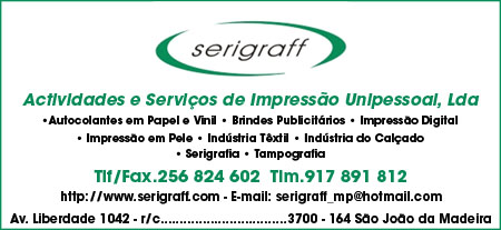 Avenida Liberdade 1042-r/c, São João da Madeira Madeira,3700-164 - SÃO JOÃO DA MADEIRA 256 824 602 Telemóvel 917 891 812 Fax 256 824 602 serigraff_mp@hotmail.com http://www.serigraff.com